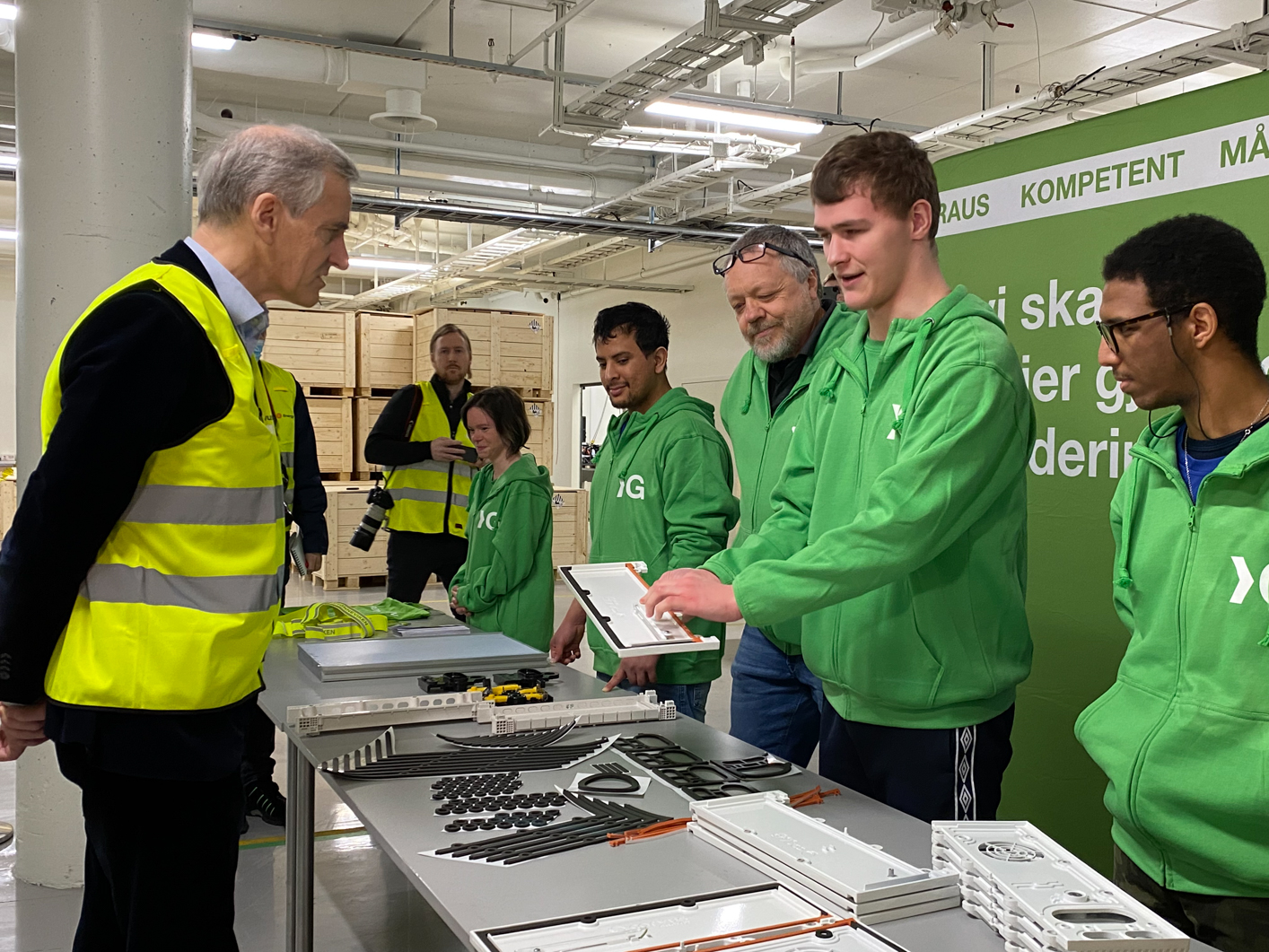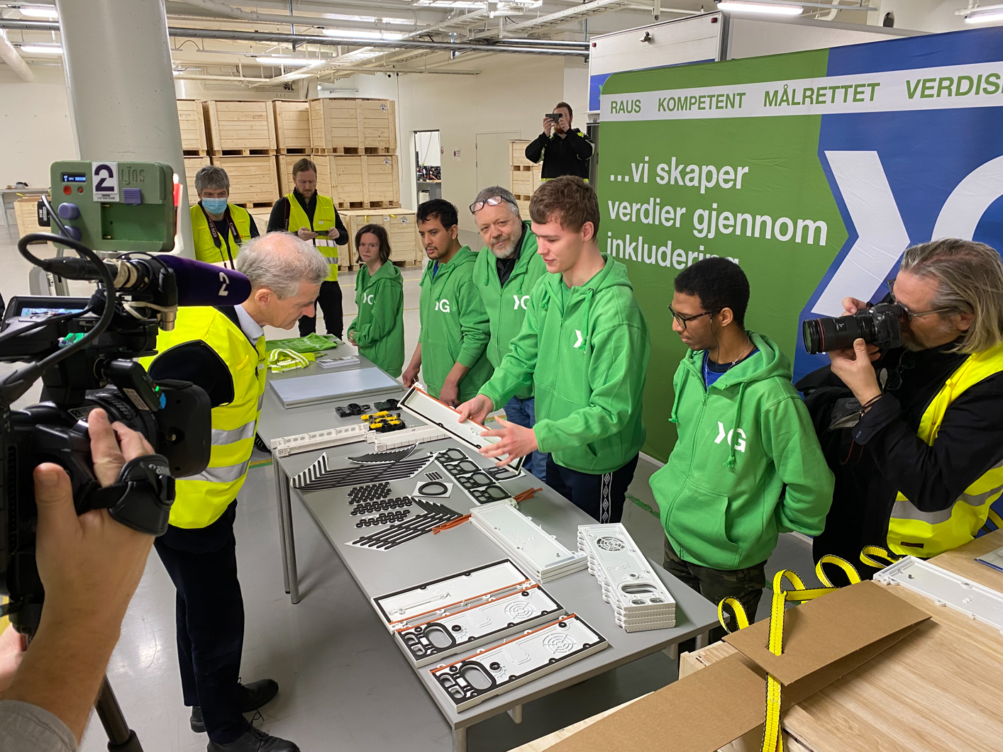 Under statsministerbesøket på fabrikken til Corvus Energy hadde Grønneviken rigget opp en egen «produksjonslinje» som viser deler av den omfattende produksjonen vi gjør for Corvus.